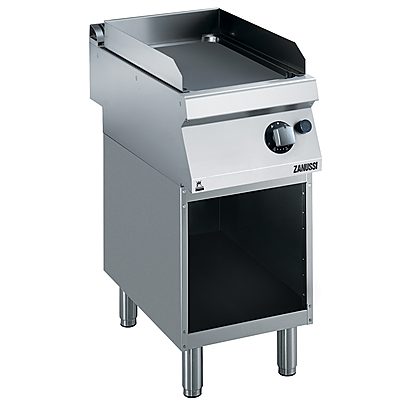 Half module gas fry top on open base with smooth brushed chrome cooking plate, sloped, thermostatic control, scraper included